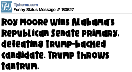 X is Roy Moore wins Alabama's Republican Senate primary, defeating Trump-backed candidate. Trump throws tantrum.