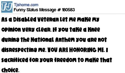 X is As a Disabled Veteran let me make my opinion very clear. If you take a knee during the National Anthem you are not disrespecting me. YOU ARE HONORING ME. I sacrificed for your freedom to make that choice.