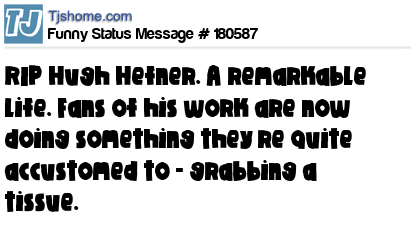 X is RIP Hugh Hefner. A remarkable life. Fans of his work are now doing something they’re quite accustomed to - grabbing a tissue.