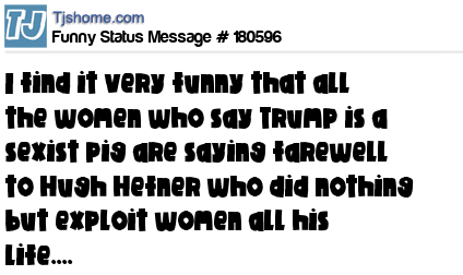 X says I find it very funny that all the women who say Trump is a sexist pig are saying farewell to Hugh Hefner who did nothing but exploit women all his life....