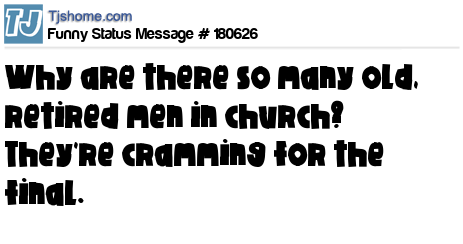 X is Why are there so many old, retired men in church? They're cramming for the final.