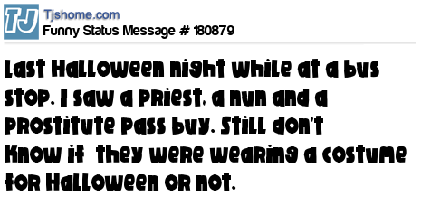 X is Last Halloween night while at a bus stop. I saw a priest, a nun and a prostitute pass buy. Still don't know if they were wearing a costume for Halloween or not.