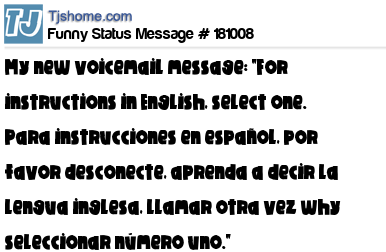 X says My new voicemail message: "For instructions in English, select one. Para instrucciones en español, por favor desconecte, aprenda a decir la lengua inglesa, llamar otra vez why seleccionar número uno."