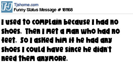- # 157641 I once complained that I had no shoes, until I met a man with no feet. So I took his shoes. I mean seriously, it's not like he needed them or anything.