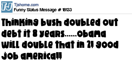 X is thinking bush doubled out debt it 8 years......obama will double that in 2! good job america!!