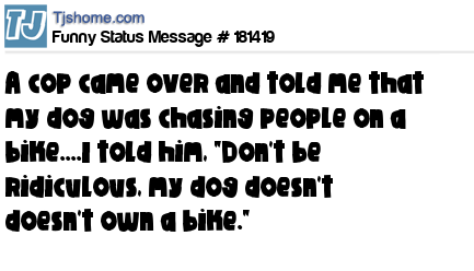 X says A cop came over and told me that my dog was chasing people on a bike....I told him, "Don't be ridiculous, my dog doesn't doesn't own a bike."