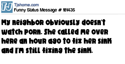 X says My neighbor obviously doesn't watch porn. She called me over here an hour ago to fix her sink and I'm still fixing the sink.