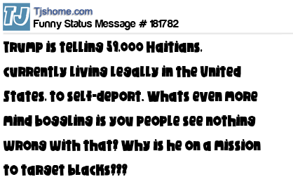 X is Trump is telling 59,000 Haitians, currently living legally in the United States, to self-deport. Whats even more mind boggling is you people see nothing wrong with that? Why is he on a mission to target blacks???