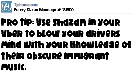 X says Pro tip: Use Shazam in your Uber to blow your drivers mind with your knowledge of their obscure immigrant music.