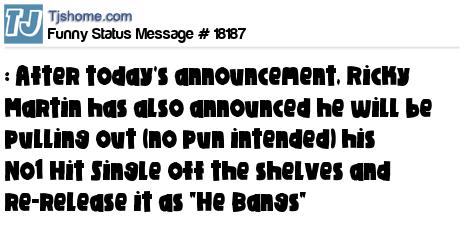 X is : After today's announcement, Ricky Martin has also announced he will be pulling out (no pun intended) his No1 Hit Single off the shelves and re-release it as "He Bangs"