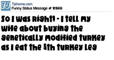 X says So I was right! - I tell my wife about buying the genetically modified turkey as I eat the 5th turkey leg
