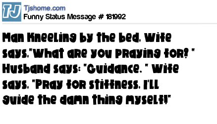 - # 81215 Man kneeling by the bed, Wife says,"What are you praying for? " Husband says: "Guidance. " Wife says, "Pray for stiffness, I'll guide the damn thing myself!"
