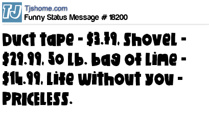 X says Duct tape - $3.79, Shovel - $29.99, 50 lb. bag of lime - $14.99, Life without you - PRICELESS.