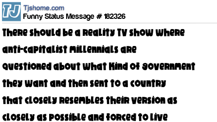 X says There should be a reality TV show where anti-capitalist millennials are questioned about what kind of government they want and then sent to a country that closely resembles their version as closely as possible and forced to live there for a few months.