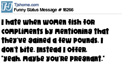 X I hate when women fish for compliments by mentioning that they've gained a few pounds. I don't bite. Instead I offer, "yeah, maybe you're pregnant."