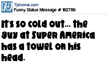 X says It's so cold out... the guy at Super America has a towel on his head.