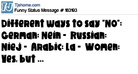 X says Different ways to say "NO": German: Nein - Russian: Niej - Arabic: La - Women: Yes, but ...