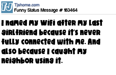 - # 145016 I named my WiFi after my last girlfriend because it's never fully connected with me. And also because I caught my neighbour using it.