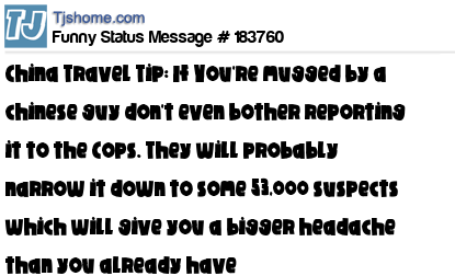 X says China Travel Tip: If You're mugged by a chinese guy don't even bother reporting it to the Cops. They will probably narrow it down to some 53,000 suspects which will give you a bigger headache than you already have