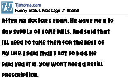 X is After my doctor's exam. He gave me a 30 day supply of some pills. And said that I'll need to take them for the rest of my life. I said that's not so bad. He said yea it is, you won't need a refill prescription.