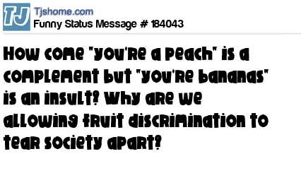 X says How come "you're a peach" is a complement but "you're bananas" is an insult? Why are we allowing fruit discrimination to tear society apart?
