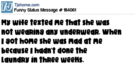 - # 165017 My wife texted me that she was not wearing any underwear. When I got home she was mad at me because I hadn't done the laundry in two weeks.