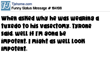 X is When asked why he was wearing a tuxedo to his vasectomy. Tyrone said, well if I'm gona be impotent, I might as well look impotent.