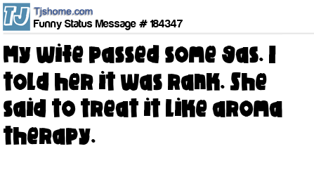 X says My wife passed some gas. I told her it was rank. She said to treat it like aroma therapy.