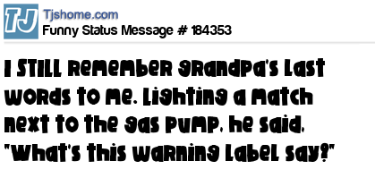 - # 186453 I remember grandpa’s last words before he died. Lighting a match next to the gas pump, he asked, “What’s this warning label say?”