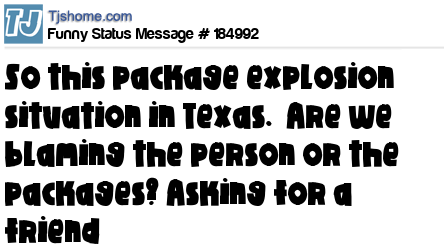 X says So this package explosion situation in Texas. Are we blaming the person or the packages? Asking for a friend
