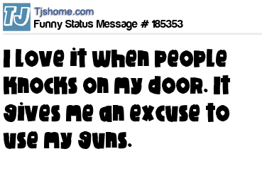 X is I love it when people knocks on my door. It gives me an excuse to use my guns.