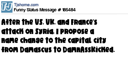 X says After the US, UK, and France's attack on Syria, I propose a name change to the capital city from Damascus to DamnAssKicked.