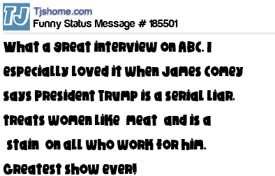 X is What a great interview on ABC. I especially loved it when James Comey says President Trump is a serial liar, treats women like “meat” and is a “stain” on all who work for him. Greatest show ever!