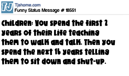 - # 37768 Children: You spend the first 2 years of their life teaching them to walk and talk. Then you spend the next 16 years telling them to sit down and shut up.