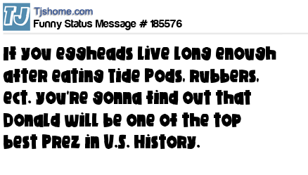 X says If you eggheads live long enough after eating Tide Pods, rubbers, ect. you're gonna find out that Donald will be one of the top best Prez in U.S. History.