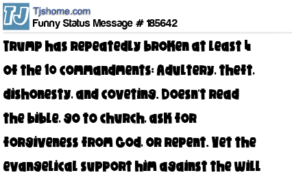 X is Trump has repeatedly broken at least 4 of the 10 commandments: Adultery, theft, dishonesty, and coveting. Doesn't read the bible, go to church, ask for forgiveness from God, or repent. Yet the evangelical support him against the will of God.