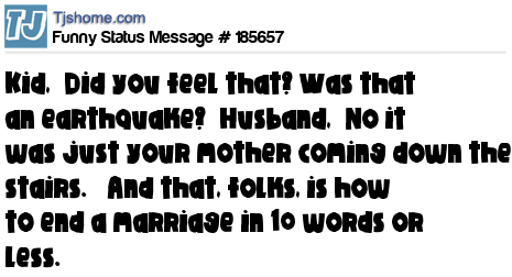 X says Kid, “Did you feel that? Was that an earthquake?” Husband, “No it was just your mother coming down the stairs.” And that, folks, is how to end a marriage in 10 words or less.