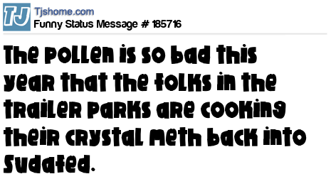 X says The pollen is so bad this year that the folks in the trailer parks are cooking their crystal meth back into Sudafed.