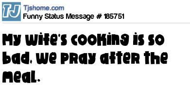 - # 19425 wifes cooking is so bad that the flies pitched in to fix the screen door. I leave dental floss in the kitchen and watch the roaches hang themselves.