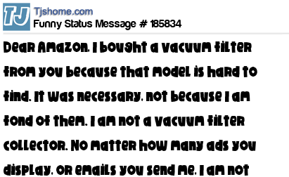 X says Dear Amazon, I bought a vacuum filter from you because that model is hard to find. It was necessary, not because I am fond of them. I am not a vacuum filter collector. No matter how many ads you display, or emails you send me, I am not desperate for more.