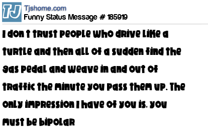 X is I don’t trust people who drive like a turtle and then all of a sudden find the gas pedal and weave in and out of traffic the minute you pass them up. The only impression I have of you is, you must be bipolar