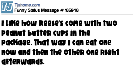 X says I like how Reese's come with two peanut butter cups in the package. That way I can eat one now and then the other one right afterwards.