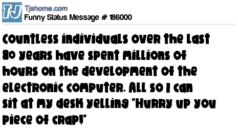 - # 192515 Countless individuals over the last 80 years have spent millions of hours on the development of the electronic computer. All so that I can sit at my desk yelling "Hurry up you stupid piece of crap!"
