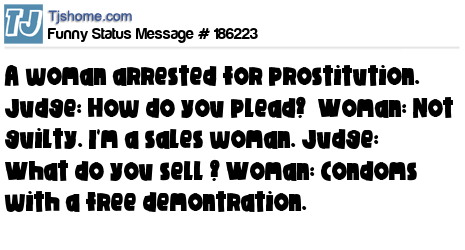 X is A woman arrested for prostitution. Judge: How do you plead? Woman: Not guilty. I'm a sales woman. Judge: What do you sell ? Woman: Condoms with a free demontration.