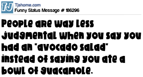 X says People are way less judgmental when you say you had an "avocado salad" instead of saying you ate a bowl of guacamole.
