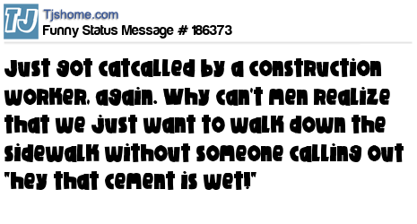 X says Just got catcalled by a construction worker, again. Why can't men realize that we just want to walk down the sidewalk without someone calling out "hey that cement is wet!"
