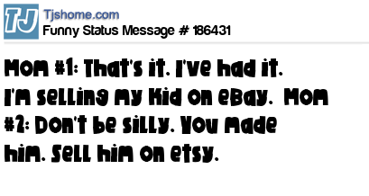 X says Mom #1: That's it. I've had it. I'm selling my kid on eBay. Mom #2: Don't be silly. You made him. Sell him on etsy.