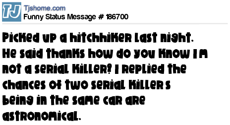 X Picked up a hitchhiker last night. He said thanks how do you know I’m not a serial killer? I replied the chances of two serial killer’s being in the same car are astronomical.