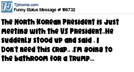 X is The North Korean President is just meeting with the US President..He suddenly stood up and said . I Don't need this Crap.. .I'm going to the bathroom for a Trump...