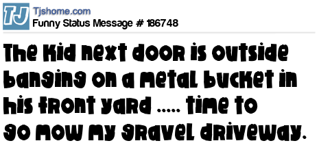 X says The kid next door is outside banging on a metal bucket in his front yard ..... time to go mow my gravel driveway.